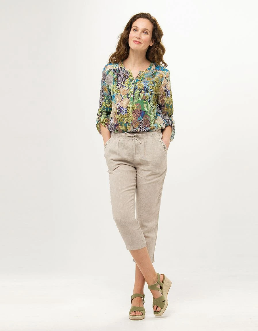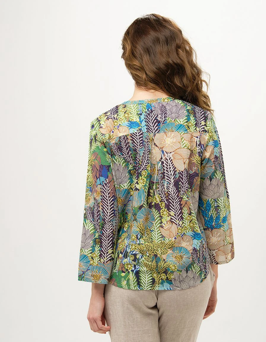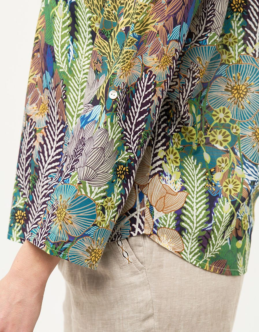 Un des crushs de notre collection : la blouse en voile de coton se pare de motifs végétaux dans une gamme de couleurs douces et fraiches : bleu, turquoise, terre, sable, écru … On aime la coupe large parfaite pour l’été et la patte à boutonner qui permet de remonter et de fixer les manches.
