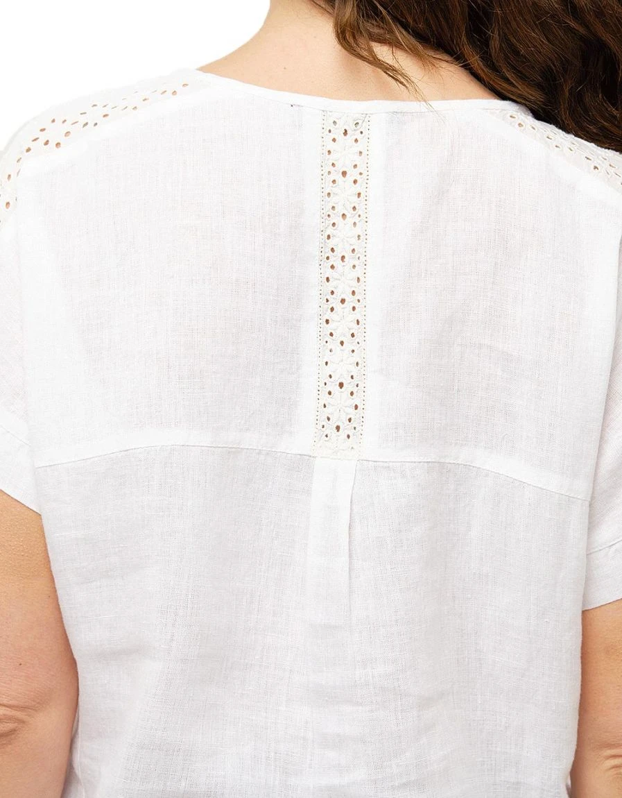 Délicat et coquet, le top en coton blanc en pince pour la broderie anglaise. Elle souligne le décolleté en V, la ligne des épaules et le milieu du dos pour un effet vintage chic.