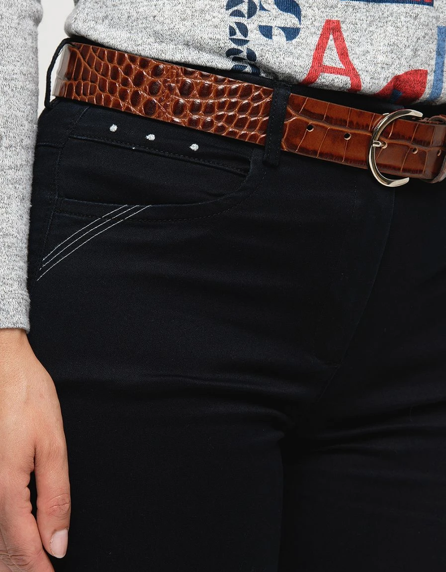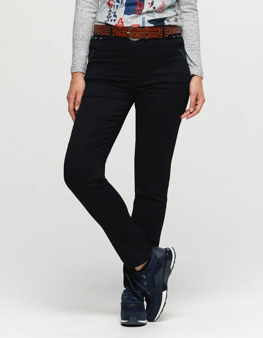 – Poches devant et dos avec surpiqûres argentées et détail clous