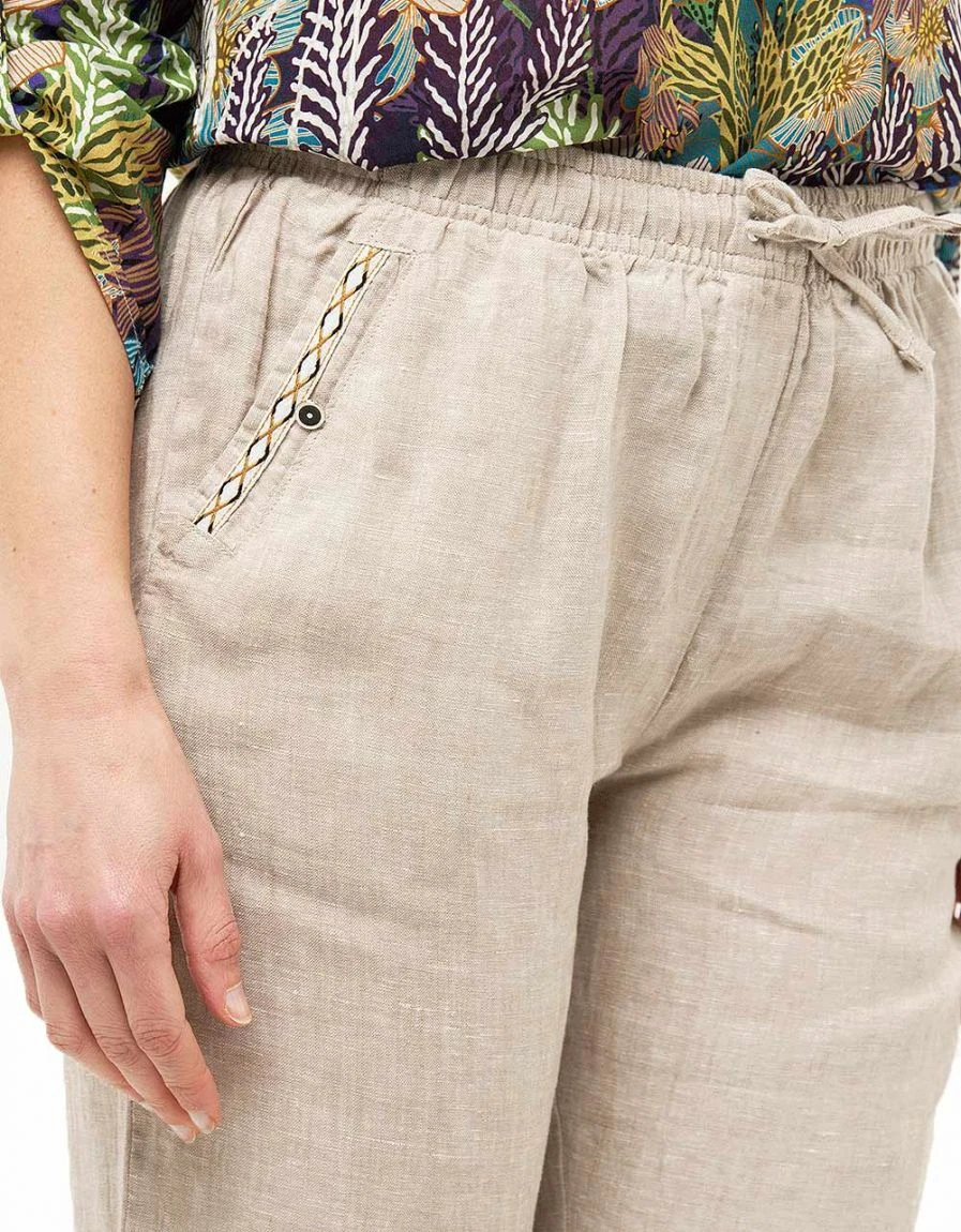 Voilà une pièce qui s’impose dans votre dressing : le pantacourt en lin. Fraicheur et confort sont les maitres mots de ce pantacourt aux nombreux atouts. La toile de lin, la jolie couleur beige sable, le galon brodé qui souligne les poches, la taille élastiquée, autant de détails irrésistibles pour un look parfait.
