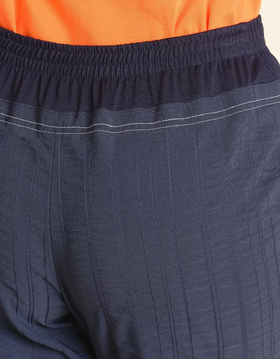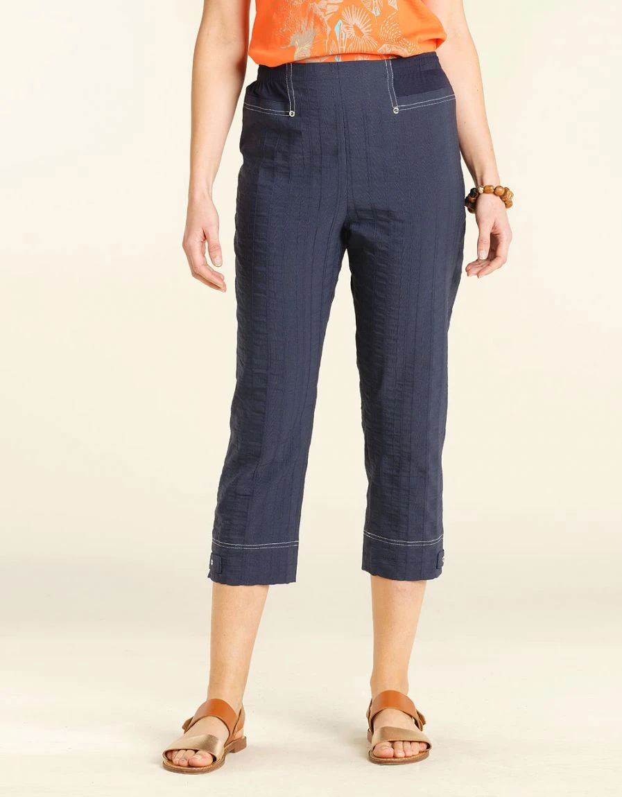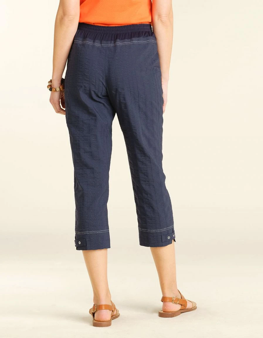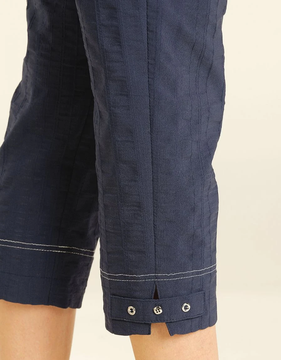 – Détails de surpiqûres contrastées aux découpes devant et bas de jambes
