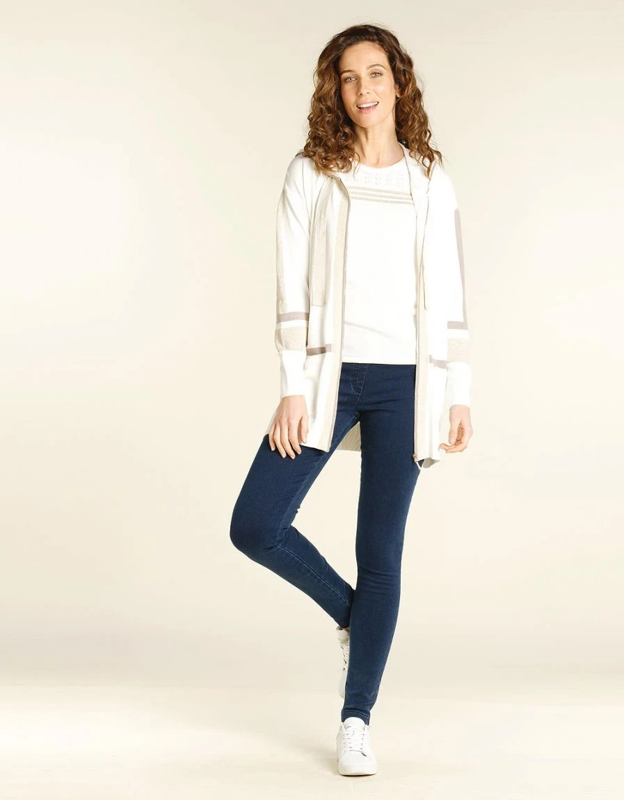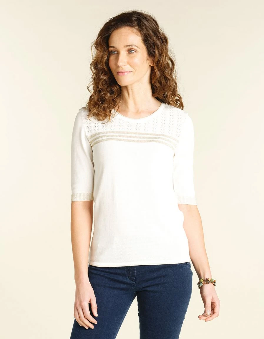 – Jeu de maille au niveau de la poitrine et jeu de rayures dorées avec fils métallisés