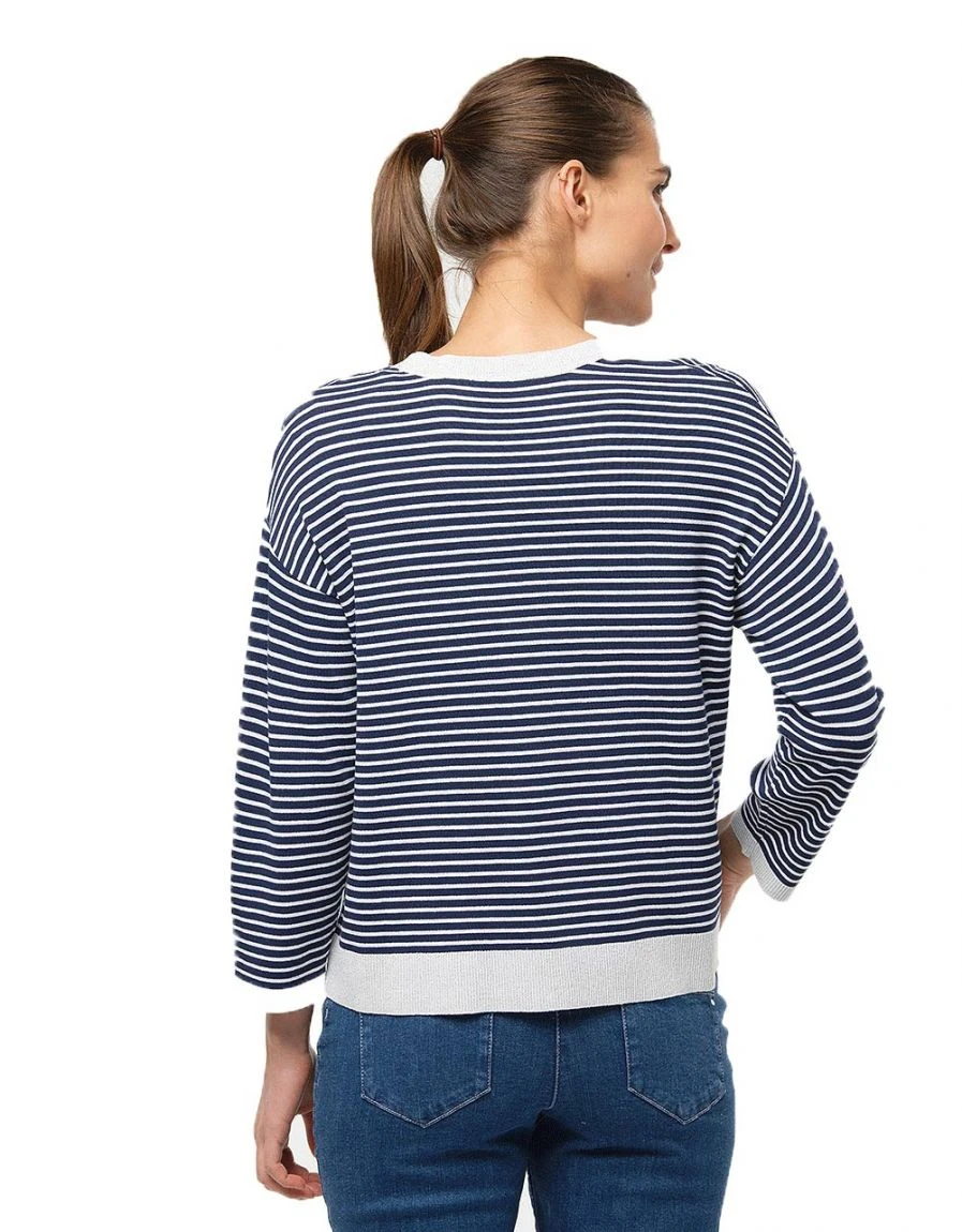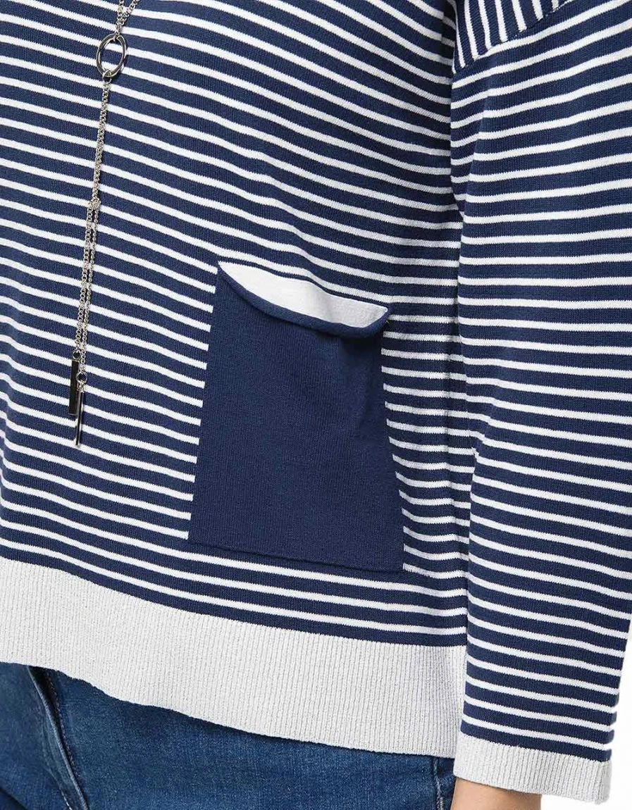 Même si vous avez déjà un pull marinière, vous ne pourrez pas résister ce modèle. Un peu oversize, légèrement raccourci, cette pièce renouvelle le genre avec bonheur. Détail mode : le collier sautoir intégré au pull.