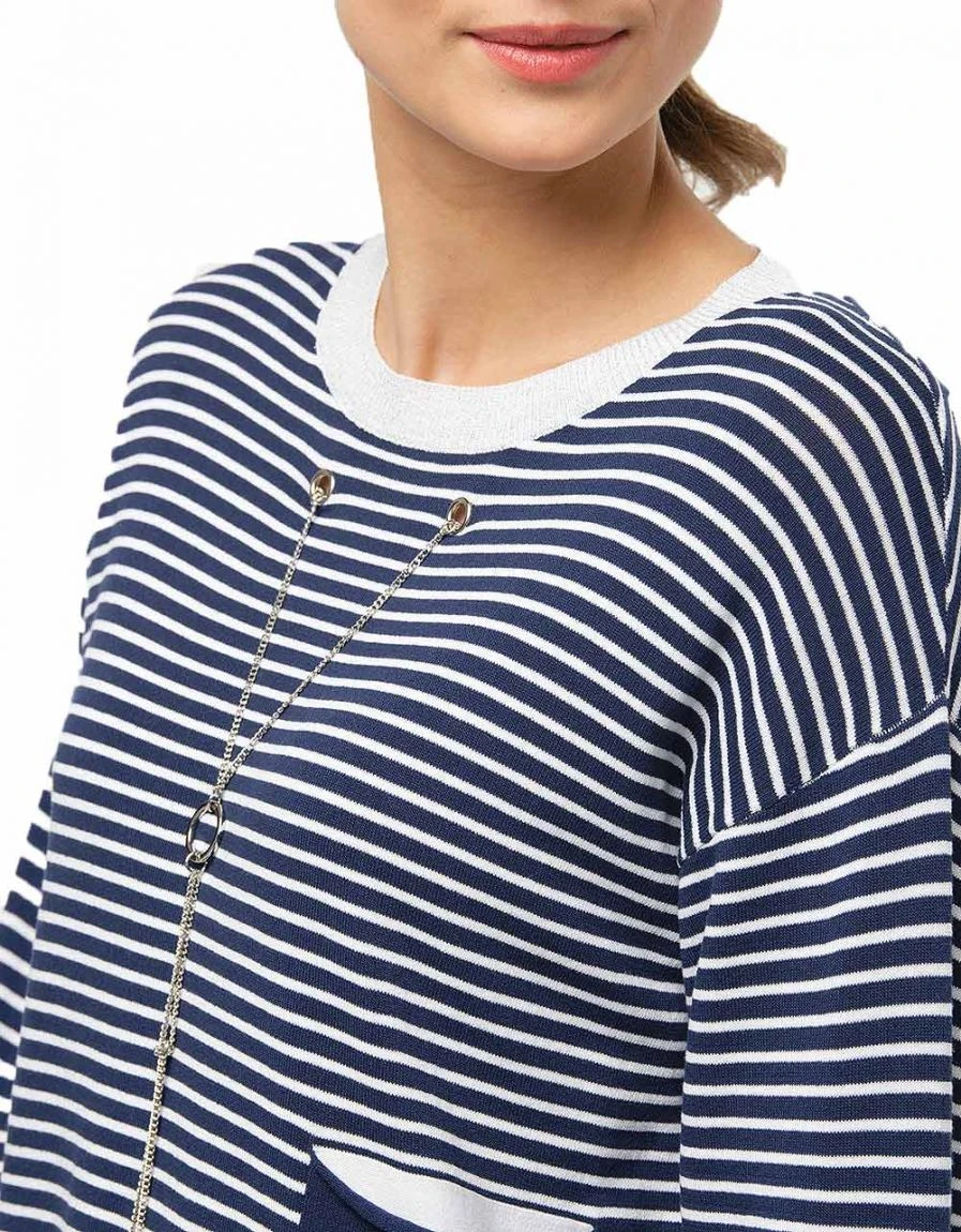 – La marinière, chouchou de toujours, est revisitée dans un volume plus court et agrémenté d’un collier effet sautoir en chaine argentée