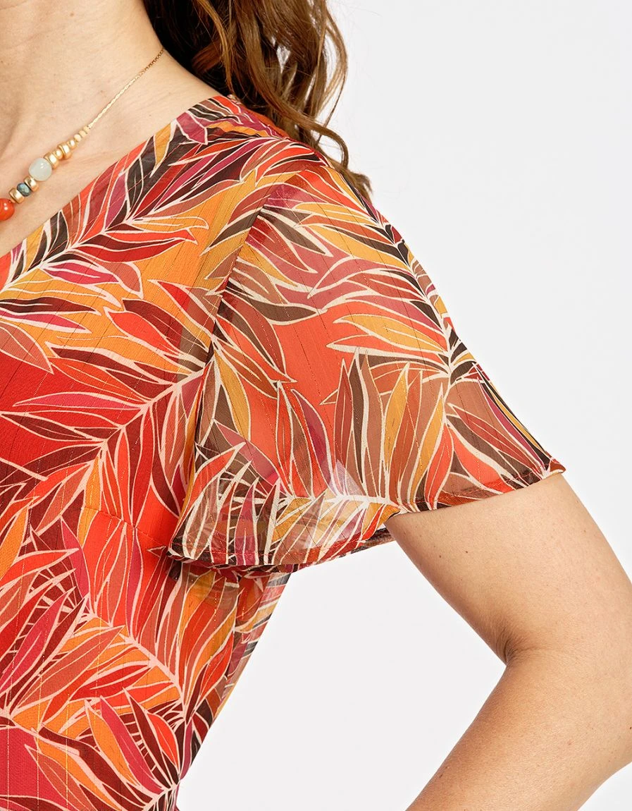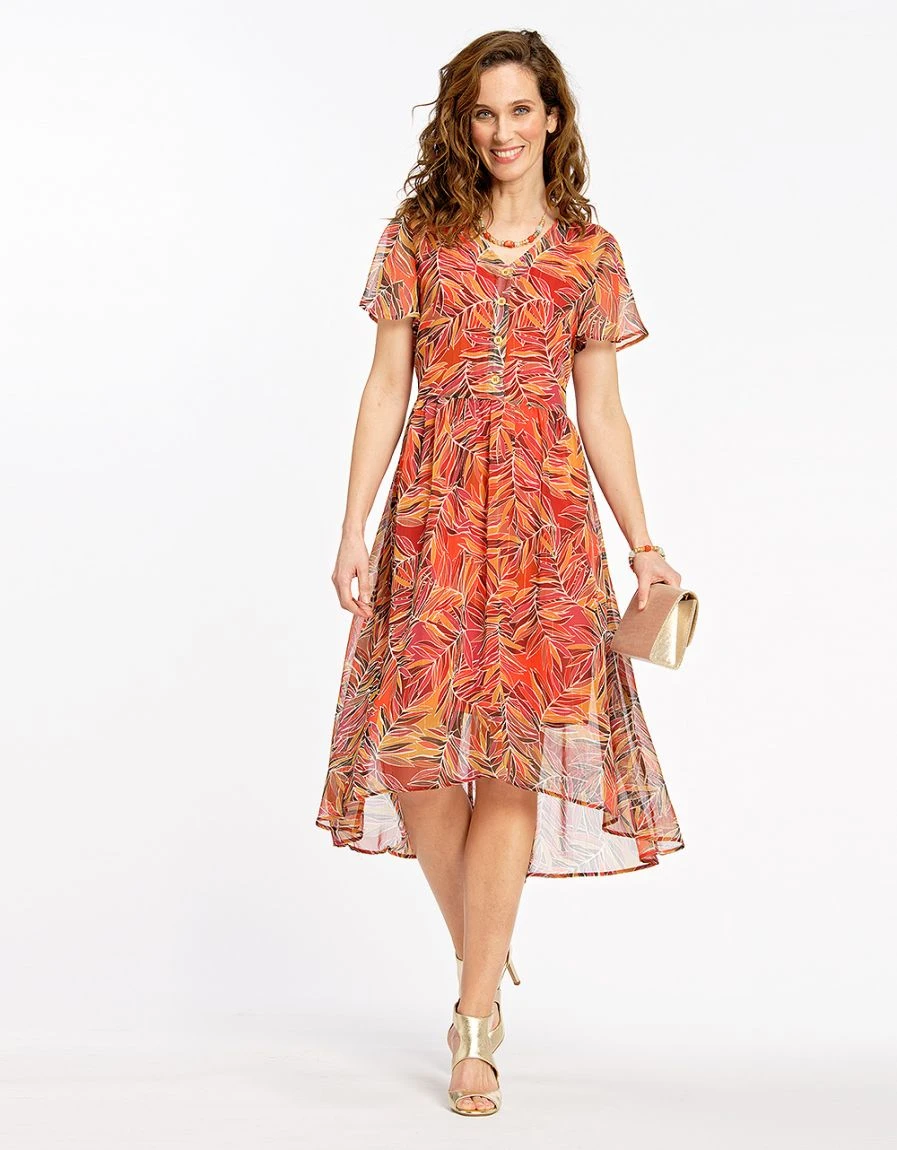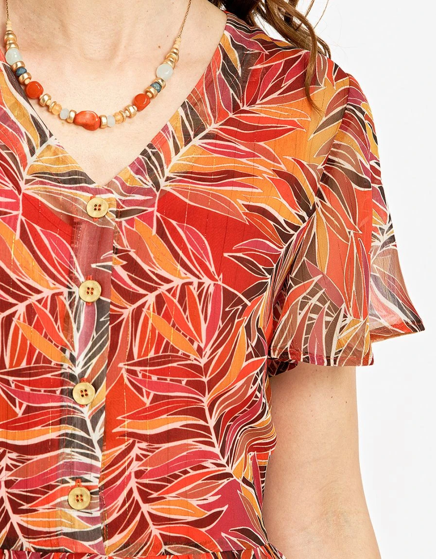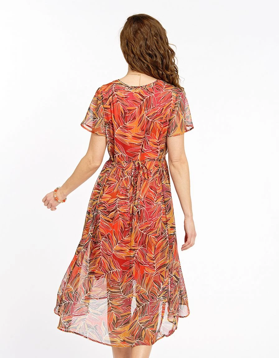 – Robe longue en voile imprimé marron et orange