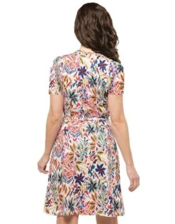 – Robe fluide à jupe évasée en tissu imprimé « hibiscus ».
