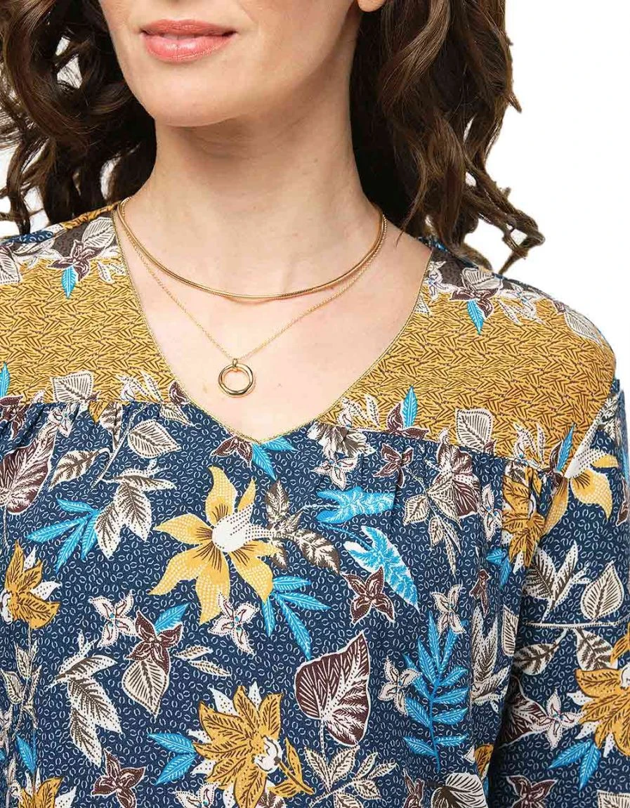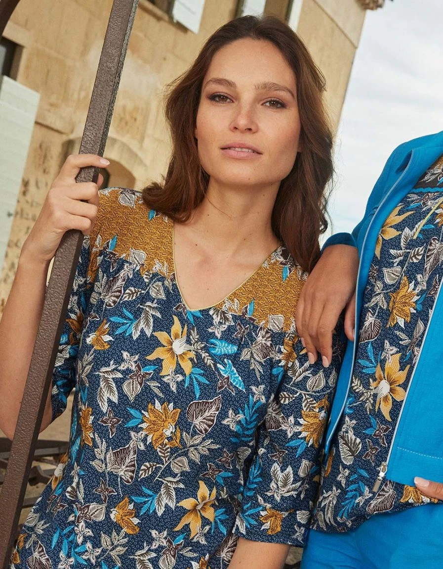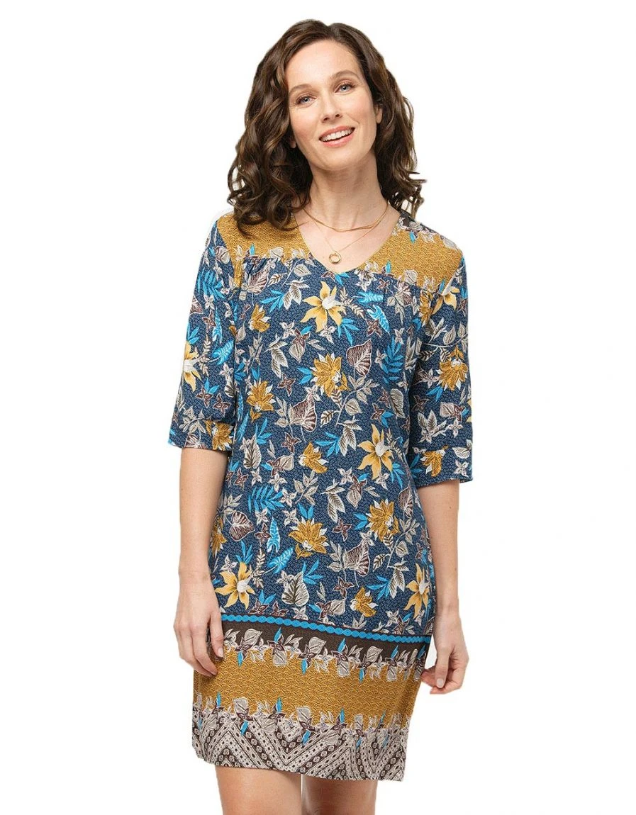 – Ethnique et déconctractée, la robe droite se pare de dessins floraux délicats dans des couleurs subtiles.