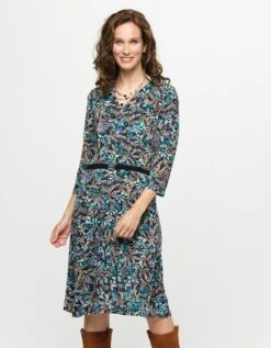 – Buste ajusté avec petits plis verticaux sur les côtés et jupe évasée plissée finement.