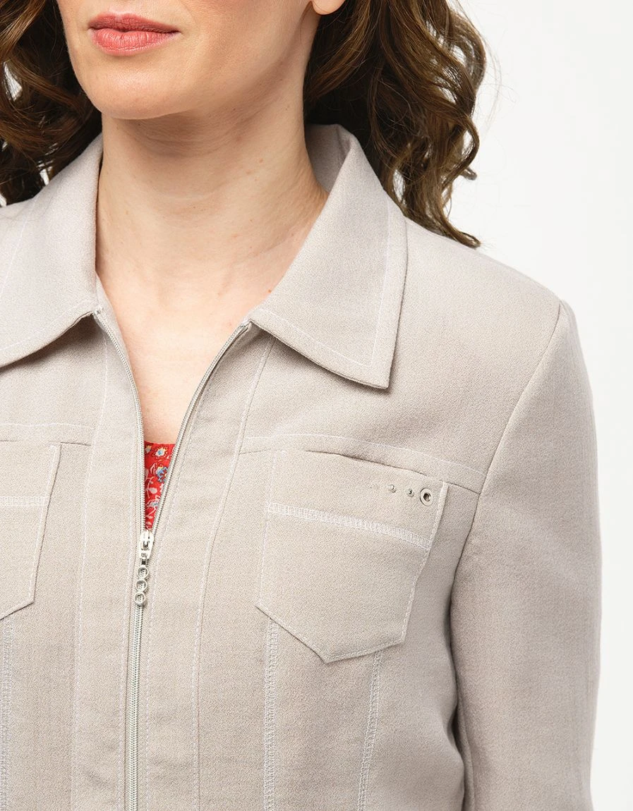 – Deux poches plaquées poitrine et deux poches verticales à simple passepoil.