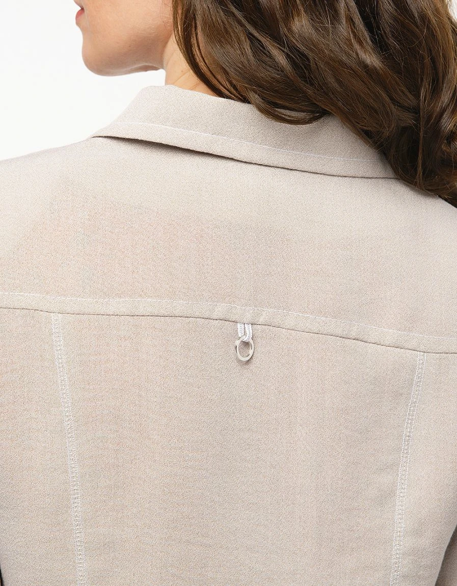 – Une veste courte bien structurée, à l’élégance sobre pour des looks précis et modernes.